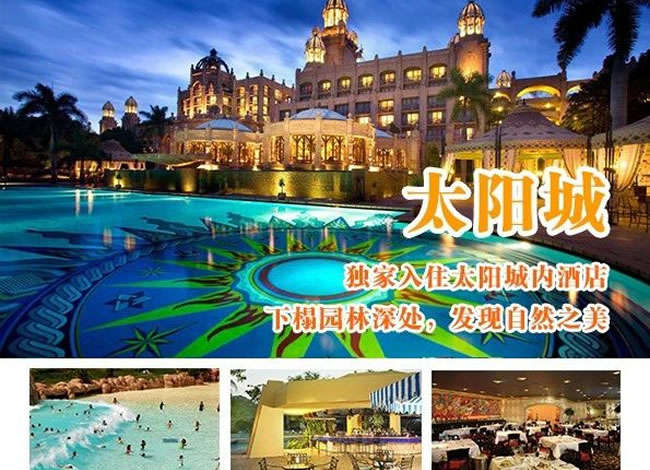 酒店早餐。前往機場,搭乘航班飛往約堡。驅車前往南半球最大的娛樂中心-太陽城。不曾身臨其境,便無法真正理解太陽城給人所帶來的震撼。將古老傳說的神秘滄桑、非洲大陸的野性粗獷和現(xiàn)代生活的便利舒適那樣完美地融合在一起。你可以在失落城探尋非洲大陸上最古老的秘密,根據(jù)神話傳說興建的地震橋以及豪華賭場、著名的建筑-失落城等。這里有清幽的湖光山色,無數(shù)的珍禽異草,游人可漫步其中享受。(含自由活動游覽時間約3小時) 晚餐后,入住太陽城內豪華酒店,您可于太陽城內賭場大顯身手。溫馨提示:約堡-太陽城,約210公里,車程約3小時