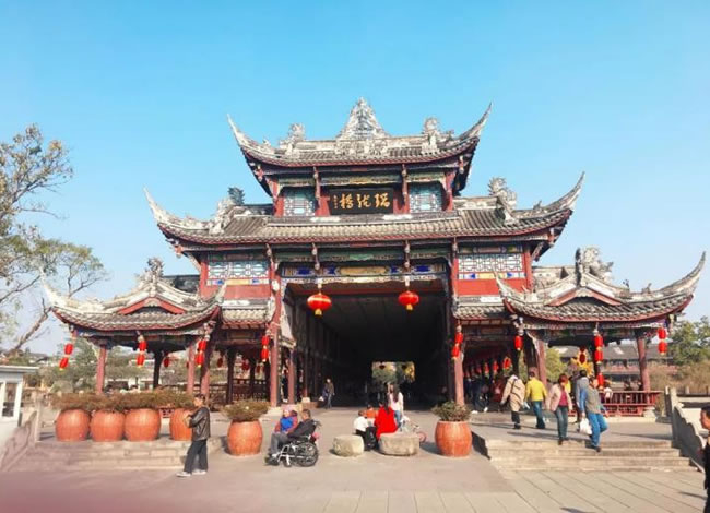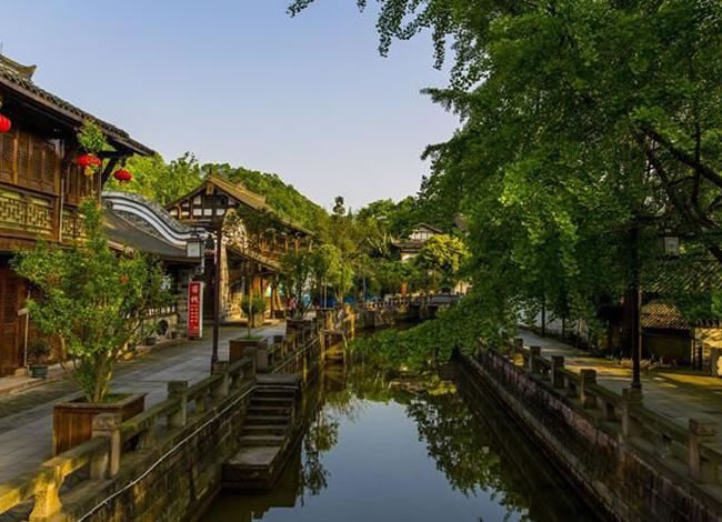 岷江的支流味江流經(jīng)地勢平緩的街子鎮(zhèn)口,形成一泓碧潭——龍?zhí)?。古?zhèn)水系發(fā)達,地下水豐富,石板路兩側(cè)及屋前院后,常年清水不斷,因而有“川西水鄉(xiāng)”之名?!扒喑呛蠡▓@”之稱。景區(qū)屬亞熱帶濕潤氣候,年平均氣溫15.9℃,盛夏氣溫低于成都市區(qū)4—5℃,全年均適宜旅游。